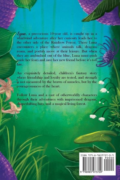 Beyond the Rainbow Forest: A Childrens Fantasy About Friendship, Loyalty, And Faith Luna, a precocious 10-year old with a school assignment, rides the train far outside her town's borders to the Rainbow Forest. Intent on catching sight of the elusive Japanese Redtail, Luna is caught up in a whirlwind adventure after following a peculiar Redtail through a tunnel in the middle of the forest. Suddenly, Luna finds herself on the other side of the Rainbow Forest, a place where animals talk, dragons roam, and portals move at their leisure. With her portal home gone, she must work alongside her new animal friends to make her way back before nightfall. But when they are ambushed out of the blue, Luna must push aside her fears and save her new friend before it's too late. ¿ An exquisitely detailed, childrens fantasy story where friendship and loyalty are tested, and strength is not measured by the brawn of muscles, but by the courageousness of the heart. ¿ Follow Luna and a cast of otherworldly characters through their adventures with imprisoned dragons, shapeshifting bats, and a magical living forest.