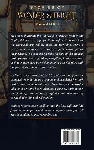 Step through Beyond the Rupt Door: Stories of Wonder and Fright, Volume 1, a gripping collection of short stories where the extraordinary collides with the terrifying. From a programmer trapped in a sinister game where failure means death, to a dragon searching for love amidst magical mishaps, to a runaway risking everything to free a captive, each tale dives deep into richly imagined worlds filled with danger, courage, and transformation. As Phil battles a debt that isn't his, Marilee navigates the complexities of dating as a dragon, and Lisa defies her dark past to save the innocent, these characters face impossible odds with grit and heart. Blending suspense, dark humor, and fantasy, this anthology explores the boundaries of survival, identity, and redemption. With each story more thrilling than the last, will they find freedom and hope, or will the forces against them prevail? Step beyond the Rupt Door to find out.