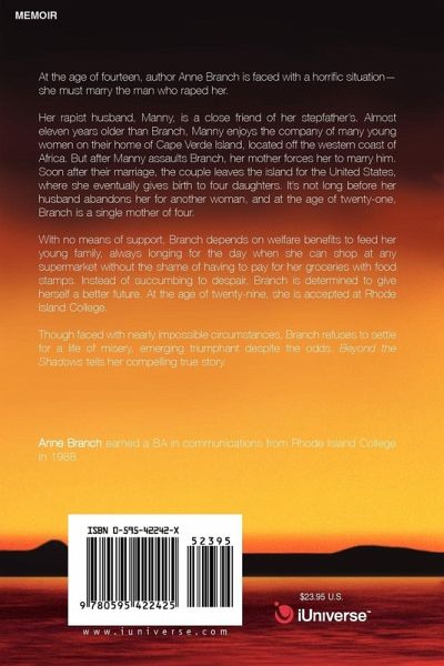 At the age of fourteen, author Anne Branch is faced with a horrific situation-she must marry the man who raped her. Her rapist husband, Manny, is a close friend of her stepfather's. Almost eleven years older than Branch, Manny enjoys the company of many young women on their home of Cape Verde Island, located off the western coast of Africa. But after Manny assaults Branch, her mother forces her to marry him. Soon after their marriage, the couple leaves the island for the United States, where she eventually gives birth to four daughters. It's not long before her husband abandons her for another woman, and at the age of twenty-one, Branch is a single mother of four. With no means of support, Branch depends on welfare benefits to feed her young family, always longing for the day when she can shop at any supermarket without the shame of having to pay for her groceries with food stamps. Instead of succumbing to despair, Branch is determined to give herself a better future. At the age of twenty-nine, she is accepted at Rhode Island College. Though faced with nearly impossible circumstances, Branch refuses to settle for a life of misery, emerging triumphant despite the odds. Beyond the Shadows tells her compelling true story.