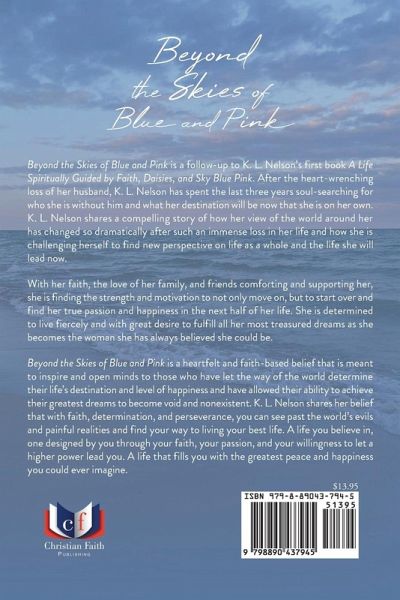 Beyond the Skies of Blue and Pink is a follow-up to K. L. Nelson's first book A Life Spiritually Guided by Faith, Daisies, and Sky Blue Pink. After the heart-wrenching loss of her husband, K. L. Nelson has spent the last three years soul-searching for who she is without him and what her destination will be now that she is on her own. K. L. Nelson shares a compelling story of how her view of the world around her has changed so dramatically after such an immense loss in her life and how she is challenging herself to find new perspective on life as a whole and the life she will lead now. With her faith, the love of her family, and friends comforting and supporting her, she is finding the strength and motivation to not only move on, but to start over and find her true passion and happiness in the next half of her life. She is determined to live fiercely and with great desire to fulfill all her most treasured dreams as she becomes the woman she has always believed she could be. Beyond the Skies of Blue and Pink is a heartfelt and faith-based belief that is meant to inspire and open minds to those who have let the way of the world determine their life's destination and level of happiness and have allowed their ability to achieve their greatest dreams to become void and nonexistent. K. L. Nelson shares her belief that with faith, determination, and perseverance, you can see past the world's evils and painful realities and find your way to living your best life. A life you believe in, one designed by you through your faith, your passion, and your willingness to let a higher power lead you. A life that fills you with the greatest peace and happiness you could ever imagine.