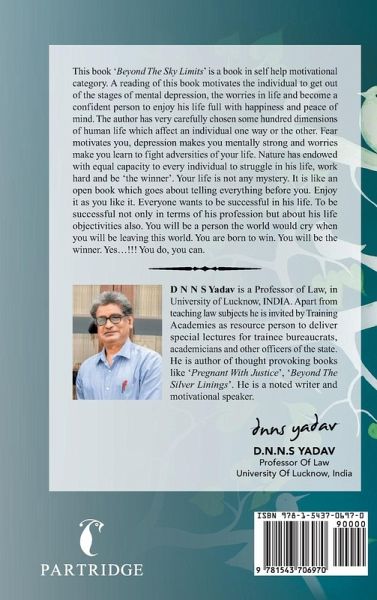 This book 'Beyond The Sky Limits' is a book in self help motivational category. A reading of this book motivates the individual to get out of the stages of mental depression, the worries in life and become a confident person to enjoy his life full with happiness and peace of mind. The author has very carefully chosen some hundred dimensions of human life which affect an individual one way or the other. Fear motivates you, depression makes you mentally strong and worries make you learn to fight adversities of your life. Nature has endowed with equal capacity to every individual to struggle in his life, work hard and be 'the winner'. Your life is not any mystery. It is like an open book which goes about telling everything before you. Enjoy it as you like it. Everyone wants to be successful in his life. To be successful not only in terms of his profession but about his life objectivities also. You will be a person the world would cry when you will be leaving this world. You are born to win. You will be the winner. Yes...!!! You do, you can.