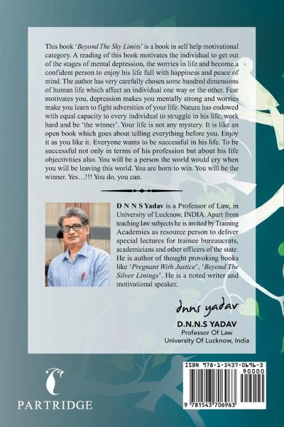 This book 'Beyond The Sky Limits' is a book in self help motivational category. A reading of this book motivates the individual to get out of the stages of mental depression, the worries in life and become a confident person to enjoy his life full with happiness and peace of mind. The author has very carefully chosen some hundred dimensions of human life which affect an individual one way or the other. Fear motivates you, depression makes you mentally strong and worries make you learn to fight adversities of your life. Nature has endowed with equal capacity to every individual to struggle in his life, work hard and be 'the winner'. Your life is not any mystery. It is like an open book which goes about telling everything before you. Enjoy it as you like it. Everyone wants to be successful in his life. To be successful not only in terms of his profession but about his life objectivities also. You will be a person the world would cry when you will be leaving this world. You are born to win. You will be the winner. Yes...!!! You do, you can.