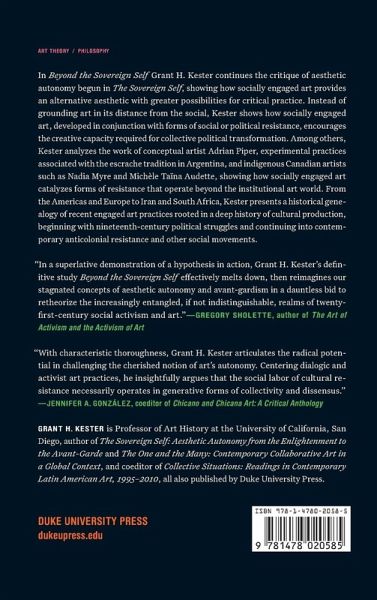 In Beyond the Sovereign Self Grant H. Kester continues the critique of aesthetic autonomy begun in The Sovereign Self, showing how socially engaged art provides an alternative aesthetic with greater possibilities for critical practice. Instead of grounding art in its distance from the social, Kester shows how socially engaged art, developed in conjunction with forms of social or political resistance, encourages the creative capacity required for collective political transformation. Among others, Kester analyzes the work of conceptual artist Adrian Piper, experimental practices associated with the escrache tradition in Argentina, and indigenous Canadian artists such as Nadia Myre and Michèle Taïna Audette, showing how socially engaged art catalyzes forms of resistance that operate beyond the institutional art world. From the Americas and Europe to Iran and South Africa, Kester presents a historical genealogy of recent engaged art practices rooted in a deep history of cultural production, beginning with nineteenth-century political struggles and continuing into contemporary anticolonial resistance and other social movements.