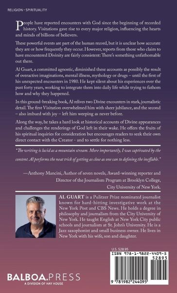 People have reported encounters with God since the beginning of recorded history. Visitations gave rise to every major religion, influencing the hearts and minds of billions of believers. These powerful events are part of the human record, but it is unclear how accurate they are or how frequently they occur. However, reports from those who claim to have encountered Divinity are fairly consistent: There's something unfathomable out there. Al Guart, a committed agnostic, diminished these accounts as possibly the result of overactive imaginations, mental illness, mythology or drugs - until the first of his unexpected encounters in 1980. He kept silent about his experiences over the past forty years, working to integrate them into daily life while trying to fathom how and why they happened. In this ground-breaking book, Al relives two Divine encounters in stark, journalistic detail. The first Visitation overwhelmed him with sheer jubilance, and the second - also imbued with joy - left him weeping as never before. Along the way, he takes a hard look at historical accounts of Divine appearances and challenges the renderings of God left in their wake. He offers the fruits of his spiritual inquiries for consideration but encourages readers to seek their own direct contact with the Creator - and to settle for nothing less.