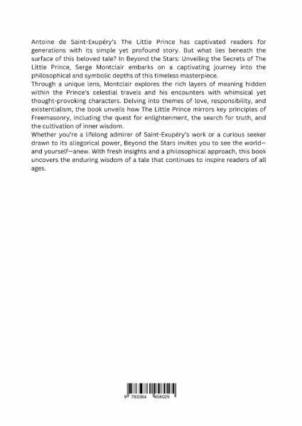 Antoine de Saint-Exupéry's The Little Prince has captivated readers for generations with its simple yet profound story. But what lies beneath the surface of this beloved tale? In Beyond the Stars: Unveiling the Secrets of The Little Prince, Serge Montclair embarks on a captivating journey into the philosophical and symbolic depths of this timeless mas-terpiece.Through a unique lens, Montclair explores the rich layers of meaning hidden within the Prince's celestial travels and his encounters with whimsical yet thought-provoking char-acters. Delving into themes of love, responsibility, and existentialism, the book unveils how The Little Prince mirrors key principles of Freemasonry, including the quest for en-lightenment, the search for truth, and the cultivation of inner wisdom.Whether you're a lifelong admirer of Saint-Exupéry's work or a curious seeker drawn to its allegorical power, Beyond the Stars invites you to see the world-and yourself-anew. With fresh insights and a philosophical approach, this book uncovers the enduring wis-dom of a tale that continues to inspire readers of all ages.