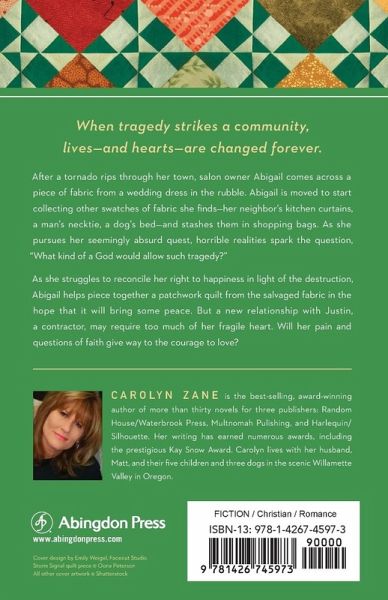 After a tornado rips through her town, store owner Abigail comes across a piece of fabric from a wedding dress among the devastation. Abigail is moved to start collecting other swatches of fabric she finds - her neighbor's kitchen curtains, a man's necktie, a dog's bed - which she stashes in shopping bags. As she pursues her seemingly absurd quest, horrible realities spark the question, "What kind of a God would allow such tragedy?" As she struggles to reconcile her right to happiness amidst the destruction, Abigail begins piecing together a patchwork quilt from the salvaged fabric in hopes it will bring some peace. But a new relationship with Justin, a contractor, may require too much of her fragile heart. Will her pain and questions of faith give way to the courage to love?