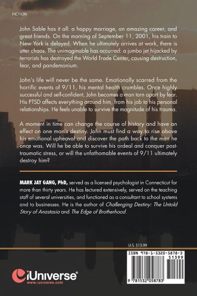 John Sable has it all: a happy marriage, an amazing career, and great friends. On the morning of September 11, 2001, his train to New York is delayed. When he ultimately arrives at work, there is utter chaos. The unimaginable has occurred: a jumbo jet hijacked by terrorists has destroyed the World Trade Center, causing destruction, fear, and pandemonium. John's life will never be the same. Emotionally scarred from the horrific events of 9/11, his mental health crumbles. Once highly successful and self-confident, John becomes a man torn apart by fear. His PTSD affects everything around him, from his job to his personal relationships. He feels unable to survive the magnitude of his trauma. A moment in time can change the course of history and have an effect on one man's destiny. John must find a way to rise above his emotional upheaval and discover the path back to the man he once was. Will he be able to survive his ordeal and conquer post-traumatic stress, or will the unfathomable events of 9/11 ultimately destroy him?