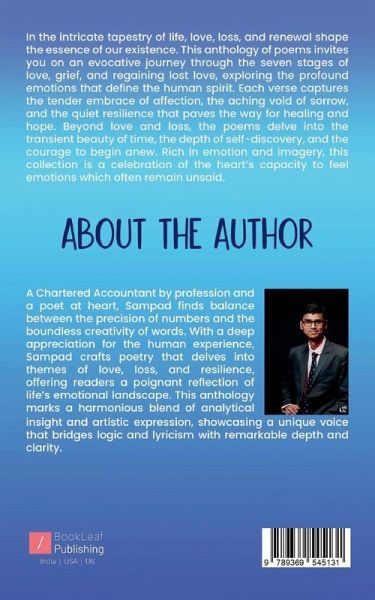 In the intricate tapestry of life, love, loss, and renewal shape the essence of our existence. This anthology of poems invites you on an evocative journey through the seven stages of love, grief, and regaining lost love, exploring the profound emotions that define the human spirit. Each verse captures the tender embrace of affection, the aching void of sorrow, and the quiet resilience that paves the way for healing and hope. Beyond love and loss, the poems delve into the transient beauty of time, the depth of self-discovery, and the courage to begin anew. Rich in emotion and imagery, this collection is a celebration of the heart's capacity to feel emotions which often remain unsaid.