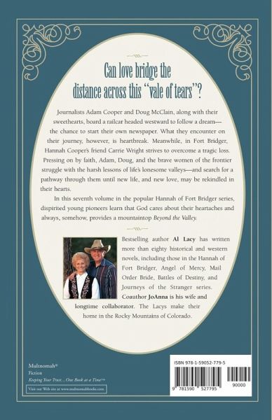 In this seventh installment in the Hannah of Fort Bridger series, twin tragedies set the stage for God's glorious provision. A vicious mountain lion attack leaves beautiful, young rancher Carrie Wright a widow. An outlaw on his way to prison escapes the law long enough to shoot Doug McClain's wife, making him the lonely father of a young daughter. Then heroine Hannah Cooper, newly widowed herself, comforts Carrie with the knowledge that while God's servants will tread through the valley of weeping, they will also keep moving toward another mountaintop. When employment opportunities bring Doug and Carrie together, unexpected sparks fly and finally they can envision a future "beyond the valley."