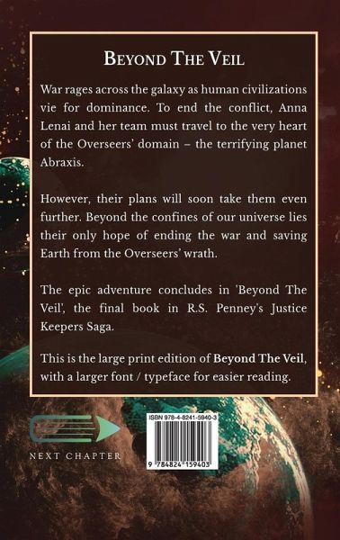 War rages across the galaxy as human civilizations vie for dominance. To end the conflict, Anna Lenai and her team must travel to the very heart of the Overseers' domain - the terrifying planet Abraxis. However, their plans will soon take them even further. Beyond the confines of our universe lies their only hope of ending the war and saving Earth from the Overseers' wrath. The epic adventure concludes in 'Beyond The Veil', the final book in R.S. Penney's Justice Keepers Saga. This is the large print edition of Beyond The Veil, with a larger font / typeface for easier reading.