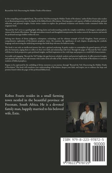 Beyond the Veil: Discovering the Hidden Truths of Revelation In this compelling and insightful book, "Beyond the Veil:Discovering the Hidden Truths of Revelation," author Kobus Fourie takes readers on an illuminating journey into the depths of the biblical book of Revelation. Drawing upon a rich tapestry of biblical scholarship, spiritual reflection, and personal insights, Fourie invites readers to explore the profound revelations and timeless truths contained within this enigmatic book. "Beyond the Veil" serves as a guiding light, offering clarity and understanding amidst the complex symbolism, vivid imagery, and prophetic visions of the book of Revelation. Through meticulous research and thoughtful interpretation, the author unravels the mysteries and unveils the profound messages hidden within the text. Delving into themes of divine judgment, redemption, eschatology, and the ultimate triumph of God's Kingdom, Fourie presents a comprehensive exploration of Revelation's prophetic vision. He examines the significance of each chapter, deciphering the symbolic language and uncovering the underlying meanings that hold deep relevance for believers today. This book is not only an intellectual journey but also a spiritual awakening. It guides readers to contemplate the grand tapestry of God's plan for humanity, urging them to reflect on their own faith and relationship with God. Through the pages of "Beyond the Veil," readers will discover fresh perspectives, gain profound insights, and find inspiration to live with hope and purpose in a world full of uncertainties. Accessible and engaging, "Beyond the Veil" bridges the gap between scholarly analysis and practical application. It offers practical insights and spiritual reflections that will resonate with readers from all walks of life, whether they are new to the book of Revelation or seasoned students of biblical prophecy. Prepare to be captivated by the unfolding of divine mysteries as you journey through "Beyond the Veil: Discovering the Hidden Truths of Revelation" This book will transform your understanding of Revelation, deepen your faith, and inspire you to embrace the hope and promise found within the pages of this profound biblical text.