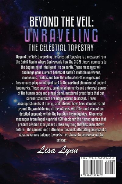 Beyond the Veil: Unraveling the celestial tapestry is a message from the spirit realm, revealing connections between ancient civilizations, their writings, and their worship to their Gods (God, God of Death (Satan) and the Universe (Milky way)). Through her dedicated mentor, Angel Nuphriel KGW, God and her assigned divine team, she introduces their recount of the beginnings of intellectual life of earth, the civilizations that have come and gone, the earth energy power grids that aligned these civilizations, and introduce their recount of the meanings behind ancient writings and hieroglyphics, and the energy power story they tell.