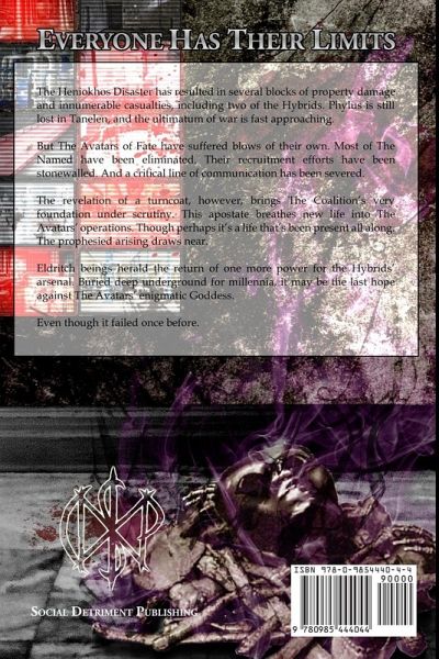 Everyone Has Their Limits The Heniokhos Disaster has resulted in several blocks of property damage and innumerable casualties, including two of the Hybrids. Phylus is still lost in Tanelen, and the ultimatum of war is fast approaching. But The Avatars of Fate have suffered blows of their own. Most of The Named have been eliminated. Their recruitment efforts have been stonewalled. And a critical line of communication has been severed. The revelation of a turncoat, however, brings The Coalition's very foundation under scrutiny. This apostate breathes new life into The Avatars' operations. Though perhaps it's a life that's been present all along. The prophesied arising draws near. Eldritch beings herald the return of one more power for the Hybrids' arsenal. Buried deep underground for millennia, it may be the last hope against The Avatars' enigmatic Goddess. Even though it failed once before.