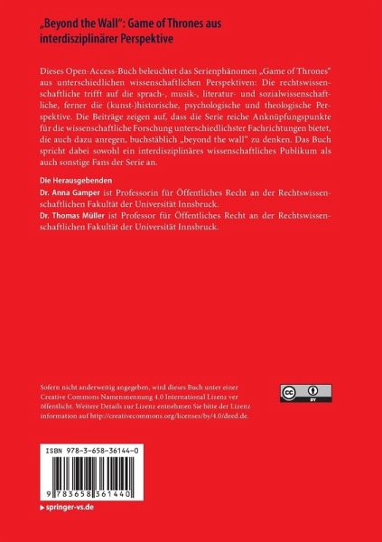 Dieses Open-Access-Buch beleuchtet das Serienphänomen "Game of Thrones" aus unterschiedlichen wissenschaftlichen Perspektiven: Die rechtswissenschaftliche trifft auf die sprach-, musik-, literatur- und sozialwissenschaftliche, ferner die (kunst-)historische, psychologische und theologische Perspektive. Die Beiträge zeigen auf, dass die Serie reiche Anknüpfungspunkte für die wissenschaftliche Forschung unterschiedlichster Fachrichtungen bietet, die auch dazu anregen, sprichwörtlich "beyond the wall" zu denken. Das Buch spricht dabei sowohl ein interdisziplinäres wissenschaftliches Publikum als auch sonstige Fans der Serie an.