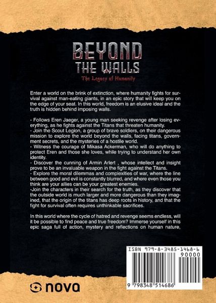 Enter a world on the brink of extinction, where humanity fights for survival against man-eating giants, in an epic story that will keep you on the edge of your seat. In this world, freedom is an elusive ideal and the truth is hidden behind imposing walls. - Follows Eren Jaeger, a young man seeking revenge after losing everything, as he fights against the Titans that threaten humanity. - Join the Scout Legion, a group of brave soldiers, on their dangerous mission to explore the world beyond the walls, facing titans, government secrets, and the mysteries of a hostile world. - Witness the courage of Mikasa Ackerman, who will do anything to protect Eren and those she loves, while trying to understand her own identity. - Discover the cunning of Armin Arlert, whose intellect and insight prove to be an invaluable weapon in the fight against the Titans. - Explore the moral dilemmas and complexities of war, where the line between good and evil is constantly blurred, and where even those you think are your allies can be your greatest enemies. -Join the characters in their search for the truth, as they discover that the outside world is much larger and more dangerous than they imagined, that the origin of the titans has deep roots in history, and that the fight for survival often requires unthinkable sacrifices. In this world where the cycle of hatred and revenge seems endless, will it be possible to find peace and true freedom? Immerse yourself in this epic saga full of action, mystery and reflections on human nature, where every decision has enormous weight and each character will fight with everything they have to protect what they believe is right. Don't miss this masterpiece that has captivated millions of viewers and readers around the world. - Nova makes no warranties or representations as to the accuracy or completeness of the contents of this book.