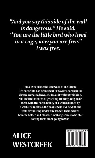 "And you say this side of the wall is dangerous." He said. "You are the little bird who lived in a cage, now you are free." I was free. Julia lives inside the safe walls of the Union. Her entire life had been spent in poverty, so when the chance comes to leave, she takes it without thinking. She endures months of gruelling training, only to be faced with the harsh reality of a world divided by a wall. The radiates, the people who live beyond the wall, are uniting under one leader. Their actions become bolder and bloodier, nothing seems to be able to stop them from going to war.