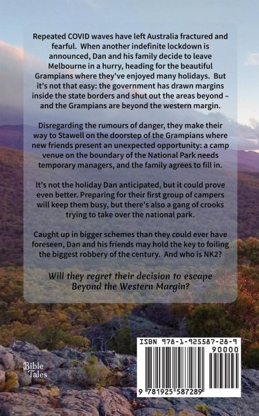 Repeated COVID waves have ravaged Australia, leaving the country fractured and fearful. When Dan and his family learn that the latest COVID-19 outbreak is about to spark yet another indefinite lockdown, they decide to leave Melbourne in a hurry - and where better to go than the beautiful Grampians, where they've enjoyed many past holidays? Yet it's not that easy: the government has pulled back from the old state borders, drawing new boundaries they call margins - and the Grampians are beyond the western margin. Tales tell of all kinds of dangers out there, beyond the rule of law. Disregarding the rumours, they make their way to Stawell, on the doorstep of the Grampians. As they explore the town, new friends present an unexpected opportunity: a camp venue in Roses Gap on the boundary of the National Park needs a temporary manager, and the family seems ideal for the job. It's not the holiday Dan anticipated, but it could prove even better. Preparing for their first group of campers will certainly leave no time for boredom! But there is some truth in the rumours and crooks who have taken over Halls Gap are now seeking to control the entire national park! Caught up in bigger schemes than they could ever have foreseen, Dan and his friends may hold the key to foiling the biggest robbery of the century. But who is NK2? Will they regret their decision to escape Beyond the Western Margin?