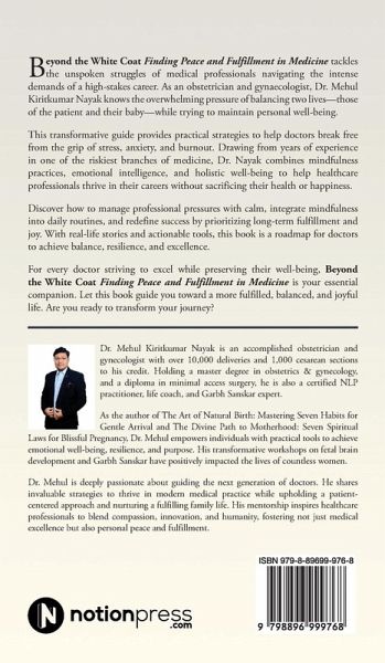 Beyond the White Coat Finding Peace and Fulfillment in Medicine tackles the unspoken struggles of medical professionals navigating the intense demands of a high-stakes career. As an obstetrician and gynaecologist, Dr. Mehul Kiritkumar Nayak knows the overwhelming pressure of balancing two lives-those of the patient and their baby-while trying to maintain personal well-being. This transformative guide provides practical strategies to help doctors break free from the grip of stress, anxiety, and burnout. Drawing from years of experience in one of the riskiest branches of medicine, Dr. Nayak combines mindfulness practices, emotional intelligence, and holistic well-being to help healthcare professionals thrive in their careers without sacrificing their health or happiness. Discover how to manage professional pressures with calm, integrate mindfulness into daily routines, and redefine success by prioritizing long-term fulfillment and joy. With real-life stories and actionable tools, this book is a roadmap for doctors to achieve balance, resilience, and excellence. For every doctor striving to excel while preserving their well-being, Beyond the White Coat Finding Peace and Fulfillment in Medicine is your essential companion. Let this book guide you toward a more fulfilled, balanced, and joyful life. Are you ready to transform your journey?