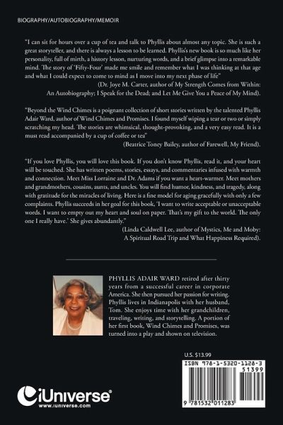 "I can sit for hours over a cup of tea and talk to Phyllis about almost any topic. She is such a great storyteller, and there is always a lesson to be learned. Phyllis's new book is so much like her personality, full of mirth, a history lesson, nurturing words, and a brief glimpse into a remarkable mind. The story of 'Fifty-Four' made me smile and remember what I was thinking at that age and what I could expect to come to mind as I move into my next phase of life" (Dr. Joye M. Carter, author of My Strength Comes from Within: An Autobiography; I Speak for the Dead; and Let Me Give You a Peace of My Mind). "Beyond the Wind Chimes is a poignant collection of short stories written by the talented Phyllis Adair Ward, author of Wind Chimes and Promises. I found myself wiping a tear or two or simply scratching my head. The stories are whimsical, thought-provoking, and a very easy read. It is a must read accompanied by a cup of coffee or tea" (Beatrice Toney Bailey, author of Farewell, My Friend). "If you love Phyllis, you will love this book. If you don't know Phyllis, read it, and your heart will be touched. She has written poems, stories, essays, and commentaries infused with warmth and connection. Meet Miss Lorraine and Dr. Adams if you want a heart-warmer. Meet mothers and grandmothers, cousins, aunts, and uncles. You will find humor, kindness, and tragedy, along with gratitude for the miracles of living. Here is a fine model for aging gracefully with only a few complaints. Phyllis succeeds in her goal for this book, 'I want to write acceptable or unacceptable words. I want to empty out my heart and soul on paper. That's my gift to the world. The only one I really have.' She gives abundantly." (Linda Caldwell Lee, author of Mystics, Me and Moby: A Spiritual Road Trip and What Happiness Required).