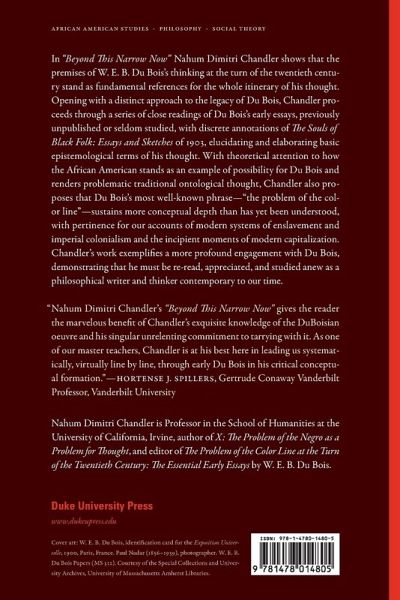 In "Beyond This Narrow Now" Nahum Dimitri Chandler shows that the premises of W. E. B. Du Bois's thinking at the turn of the twentieth century stand as fundamental references for the whole itinerary of his thought. Opening with a distinct approach to the legacy of Du Bois, Chandler proceeds through a series of close readings of Du Bois's early essays, previously unpublished or seldom studied, with discrete annotations of The Souls of Black Folk: Essays and Sketches of 1903, elucidating and elaborating basic epistemological terms of his thought. With theoretical attention to how the African American stands as an example of possibility for Du Bois and renders problematic traditional ontological thought, Chandler also proposes that Du Bois's most well-known phrase-"the problem of the color line"-sustains more conceptual depth than has yet been understood, with pertinence for our accounts of modern systems of enslavement and imperial colonialism and the incipient moments of modern capitalization. Chandler's work exemplifies a more profound engagement with Du Bois, demonstrating that he must be re-read, appreciated, and studied anew as a philosophical writer and thinker contemporary to our time.