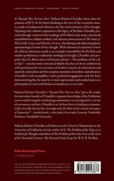In "Beyond This Narrow Now" Nahum Dimitri Chandler shows that the premises of W. E. B. Du Bois's thinking at the turn of the twentieth century stand as fundamental references for the whole itinerary of his thought. Opening with a distinct approach to the legacy of Du Bois, Chandler proceeds through a series of close readings of Du Bois's early essays, previously unpublished or seldom studied, with discrete annotations of The Souls of Black Folk: Essays and Sketches of 1903, elucidating and elaborating basic epistemological terms of his thought. With theoretical attention to how the African American stands as an example of possibility for Du Bois and renders problematic traditional ontological thought, Chandler also proposes that Du Bois's most well-known phrase-"the problem of the color line"-sustains more conceptual depth than has yet been understood, with pertinence for our accounts of modern systems of enslavement and imperial colonialism and the incipient moments of modern capitalization. Chandler's work exemplifies a more profound engagement with Du Bois, demonstrating that he must be re-read, appreciated, and studied anew as a philosophical writer and thinker contemporary to our time.