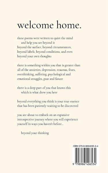 Beyond Thoughts is a poetry collection that explores the root cause of anxiety, depression, guilt, shame, negative thinking, and emotional suffering to help you heal. This book will take you on a beautiful journey of self-discovery, self-love, happiness, hope, and deep healing to help you find inner peace in a simple, yet profound way. Here's What You'll Discover:How to let go of negative thinking, anxiety, guilt, and shame How to hold space for yourself and all emotions so that you are less affected by them How to heal from the past and let go of the fear of the future How to end the vicious cycle of self-judgment How to love yourself and others unconditionally How to find yourself and discover who you truly are How to let go of self-limiting beliefs How to find happiness and peace in the present moment no matter what you are going through How to trust yourself and develop strength, confidence, and courage in yourself again How to become conscious of the subconscious, so that it stops controlling you and you can finally be liberated How to not only be okay in the unknown, but to thrive in it to create an abundant life filled with love and joy There is something within you that is greater than everything you've ever been through. There is a deep part of you that knows this, which is what drew you here. Beyond everything you think is your true essence that has been patiently waiting to be discovered. Welcome home.