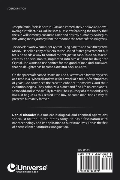 This story starts with a kid by watching television heard the theory that the Earth will be consumed by the sun, the fear of this caused an incredible journey, from the Moon to the center of The Milky way, and the inventions of a group of people that made journey possible. Joseph Stine is the main character; he developed a new computer system using Nanites. He called the system MANN, this system morphs into the main character over thousands of years of evolution of the Nanites, this happened due to Joe experimenting on himself with medical Nanites to keep him strong and healthy. He sold a copy of MANN to the U.S government, but felt he needed a way to control MANN and MANN 2, and creates a Special Nanite, implanted into himself and his daughter Crystal, Joe wanted to use Nanites for the good of Mankind, Crystal not so much. Joe goes to the far reaches of space, Crystal stayed behind on Earth and became a dictator, but was killed by an act of God. That bothered Joe and he would think of it often. On the space craft named "Home", the Joe and the crew slept for 20 years in a Hybercell and would wake up for a week at a time, over hundreds of years Joe convinced the crew to agree to enhancing themselves with Nanites for their health and wellbeing. They agree, and their evolution began. They colonize a planet, and find life on exo-planets, some odd, some awfully familiar. Alien life that had depleted their home planet of everything and forced to recycle minerals, and everything they needed from other places. In order for Joe to get their technology he infected them with Nanites, speeding transportation to faster than the speed of light. A thousand years later Joe, no longer existed, and had become Special. Special then evolves into a mass of Nanites and after a few thousand years they try to return to Earth, but something was keeping them away. Special makes a final attempt to escape to gravity of Sagittarius A*, when it meets God.