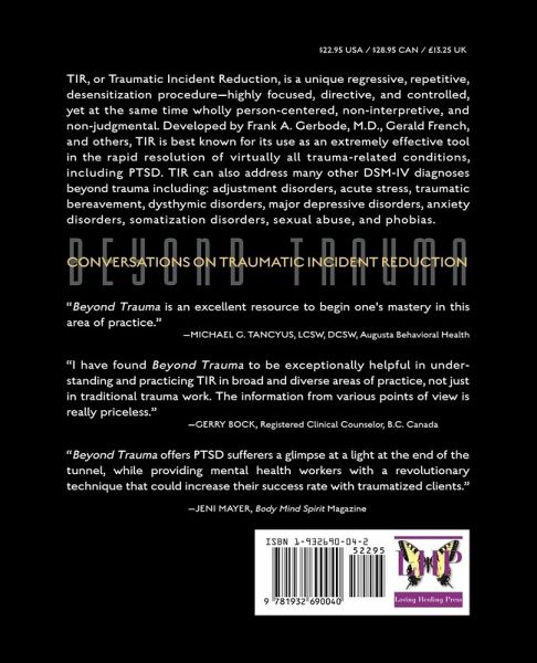 Victor Volkman has created a tool that takes the mystery out of one of the more remarkably effective clinical procedures in a way that can help millions of people revitalize and improve their lives. To those desperate people who have experienced trauma or tragedy, this process is a pathway to dealing with their feelings and getting on with their lives. In the new book Beyond Trauma, Conversations on Traumatic Incident Reduction Volkman presents a series of conversations with a wide range of people from many different backgrounds and experiences. Each provides his or her perspective on Traumatic Incident Reduction, or TIR for short. The book explains the techniques used by professionals and patients to help people sort out, resolve and overcome the negative effects of painful suffering. Untold countless people have to deal with trauma in a wide variety of situations: Soldiers who experience war or injury, families dealing with death, chemical or substance abuse, parental neglect, child or sexual abuse, terrorism, crime and punishment. Beyond Trauma: Conversations on Traumatic Incident Reduction (TIR), is unique in that it addresses both people suffering from the effects of traumatic stress and the practitioners who help them. This method has been effective in dealing with many areas of trauma, including Post-Traumatic Stress Disorder (PTSD), in such diverse groups as veterans, children, 9/11 survivors, motor vehicle accident and sexual abuse survivors. TIR is a brief, one-on-one, non-hypnotic, person-centered, simple, and highly structured method for permanently eliminating the negative effects of past traumas. Contributors include world-renowned experts in traumatology including Windy Dryden, Ph.D., Joyce Carbonell, Ph.D., and TIR's developer Frank A. Gerbode, M.D. Beyond Trauma highlights stories of TIR helping survivors to regain control of their lives. This book will be life changing not only for survivors of traumatic incidents but also for the professionals committed to helping them. "Not in 30+ years of practice have I used a more remarkably effective clinical procedure." --Robert H. Moore, Ph.D. What people are saying about this book: "Beyond Trauma: Conversations on Traumatic Incident Reduction is an excellent resource to begin one's mastery in this area of practice." --Michael G. Tancyus, LCSW, DCSW, Augusta Behavioral Health. "I have found Beyond Trauma to be EXCEPTIONALLY HELPFUL in understanding and practicing TIR in broad and diverse areas of practice, not just in traditional trauma work. The information from various points of view is really priceless." --Gerry Bock, Registered Clinical Counsellor, B.C. Canada "Beyond Trauma offers PTSD sufferers a glimpse at a light at the end of the tunnel, while providing mental health workers with a revolutionary technique that could increase their success rate with traumatized clients" --Jeni Mayer, Body Mind Spirit Magazine "Having read the book, I feel that I have already become better at working with distressed clients." -- Bob Rich, Ph.D Learn more at www.BeyondTrauma.com