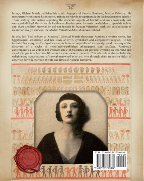 Who was Natacha Rambova, the woman often referred to as "Hollywood's most hated woman"? As the despised wife of silent film heart-throb Rudolph Valentino, she never censored her hatred of Hollywood although she achieved renown there as an art director. Despite the success of her Art Deco set designs, her beguiling beauty and alleged control over Valentino was the subject of his fans' boisterous outrage. When Rambova left Valentino in 1925 to file for divorce, she was savaged by accusations that his death a few months later was her fault. "Natacha Rambova, the name carries with it visions of onion-domed citadels and faraway places," wrote her sole biographer, Michael Morris. Yet, Rambova's roots were far less exotic; she was born in Salt Lake City to a Mormon mother and an Irish Catholic father. As a bold young artist, bookish, rebellious and stunning, she was not destined for mediocrity. Her life story includes far more than her few years spent married to Valentino. Her refusal to bow to the social dictates of her day which remanded women to domestic servitude, ensured that her life Beyond Valentino was one of independence and scholarly success. She gave lectures and taught classes on universal symbolism, comparative religion and Near Eastern art. Rambova devoted the last twenty years of her life to Egyptology, a field to which her contributions are just now starting to be fully appreciated. To date, the 1991 publication of Michael Morris' iconic, Madam Valentino stands as the definitive biographical work on Rambova. With co-author, Evelyn Zumaya, Morris recently compiled ancillary material he was not able to include in Madam Valentino to create, Beyond Valentino, The Madam Valentino Addendum. Although Michael Morris tragically passed away while working on this book, Ms. Zumaya took on the completion of his now posthumous work, "his final tribute to Rambova". Beyond Valentino includes over 250 color photographs, Rambova's unpublished writings, including her essay, "Arriba España" and excerpts from her unpublished life's work, The Cosmic Circuit. The volume contains profiles of her contemporaries and intimate circle, creating an informed and colorfully illustrated glimpse into her later life. This 538-page compendium also includes the authoritative commentary and analysis of several renowned scholars, who through their expertise delve deeper into the fascinating life and times of Natacha Rambova. For more photographs and information visit, www.beyondvalentino.com or the publisher's website www.viplibri.net.