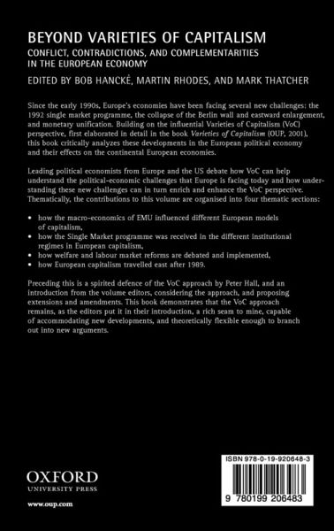 * Part 1: Varieties of Capitalism: Taking Stock * 1: Martin Rhodes, Bob Hancké and Mark Thatcher: Introduction: Beyond Varieties of Capitalism * 2: Peter Hall: The Evolution of Varieties of Capitalism in Europe * Part 2: Macro-adjustment and Varieties of Capitalism * 3: David Soskice: Macroeconomics and Varieties of Capitalism * 4: Bob Hancké and Andrea Monika Herrmann: Wage bargaining and Comparative Advantage in EMU * Part 3: The Single Market, Regulation, and Firms * 5: Mark Thatcher: Reforming National Regulatory Institutions: The EU and cross-national variety in European network industries * 6: Alexander Börsch: Globalization, Institutional Variation and coordination patterns in CMEs: Swiss and German Corporate Governance in Comparison * 7: Michel Goyer: Capital Mobility, Varieties of Institutional Investors and the Transforming Stability of Corporate Governance in France and Germany * Part 4: Labour Market and Welfare State Adjustment * 8: Martin Rhodes and Oscar Molina: The Political Economy of Adjustment in Mixed Market Economies: A Study of Spain and Italy * 9: Anke Hassel: What Does Business Want? Labour Market Reform in CMEs and its Problems * 10: Torben Iversen: Economic Shocks and Varieties of Government Responses * Part 5: Capitalism Goes East * 11: Lawrence King: Central European Capitalism in Comparative Perspective * 12: Magnus Feldmann: The origins of Varieties of Capitalism: Lessons from post-Socialist transition in Estonia and Slovenia * 13: Vlad Mykhnenko: Strengths and Weaknesses of 'Weak' Co-ordination: Economic institutions, revealed comparative advantages and socio-economic performance of Mixed-Market Economies in Poland and Ukraine