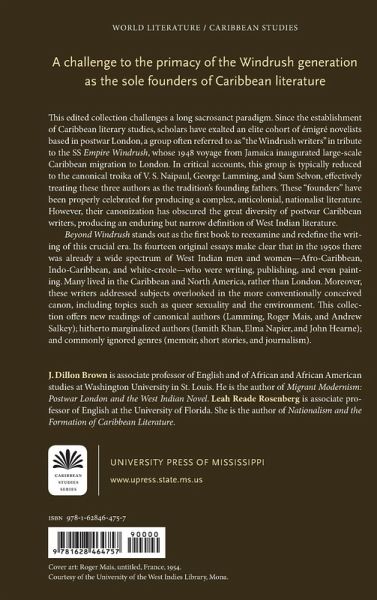 A challenge to the primacy of the Windrush generation as the sole founders of Caribbean literature Contributors: Edward Baugh, Michael Bucknor, Raphael Dalleo, Alison Donnell, Nadia Ellis, Donette Francis, Glyne Griffith, Kate Houlden, Evelyn O'Callaghan, Lisa Outar, Atreyee Phukan, Kim Robinson-Walcott, Faith Smith, and Michelle Stephens This edited collection challenges a long sacrosanct paradigm. Since the establishment of Caribbean literary studies, scholars have exalted an elite cohort of émigré novelists based in postwar London, a group often referred to as "the Windrush writers" in tribute to the SS Empire Windrush, whose 1948 voyage from Jamaica inaugurated large-scale Caribbean migration to London. In critical accounts this group is typically reduced to the canonical troika of V. S. Naipaul, George Lamming, and Sam Selvon, effectively treating these three authors as the tradition's founding fathers. These "founders" have been properly celebrated for producing a complex, anticolonial, nationalist literature. However, their canonization has obscured the great diversity of postwar Caribbean writers, producing an enduring but narrow definition of West Indian literature. Beyond Windrush stands out as the first book to reexamine and redefine the writing of this crucial era. Its fourteen original essays make clear that in the 1950s there was already a wide spectrum of West Indian men and women--Afro-Caribbean, Indo-Caribbean, and white-creole--who were writing, publishing, and even painting. Many lived in the Caribbean and North America, rather than London. Moreover, these writers addressed subjects overlooked in the more conventionally conceived canon, including topics such as queer sexuality and the environment. This collection offers new readings of canonical authors (Lamming, Roger Mais, and Andrew Salkey); hitherto marginalized authors (Ismith Khan, Elma Napier, and John Hearne); and commonly ignored genres (memoir, short stories, and journalism). J. DILLON BROWN, St. Louis, Missouri, is associate professor of English and African and African American studies at Washington University in St. Louis. He is the author of Migrant Modernism: Postwar London and the West Indian Novel. LEAH READE ROSENBERG, Gainesville, Florida, is associate professor of English at the University of Florida. She is the author of Nationalism and the Formation of Caribbean Literature.