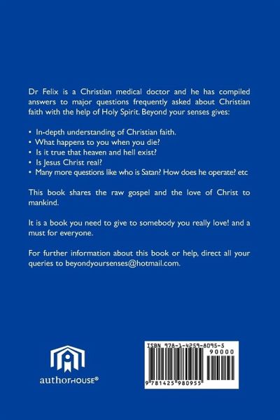 beyond your senses gives an in-depth understanding of Christian faith what happens to you when you die? is it true that heaven and hell exist? Is Jesus Christ real? who is He? Who is Satan? How does he operate? What is the cause of our afflictions or sufferings today? Is there a solution to the problems we encounter in our indivudual lives? A book you should get for your loved ones to share the love of Jesus Christ. For further informations and help send your enquiries to beyondyour senses@hotmail.com