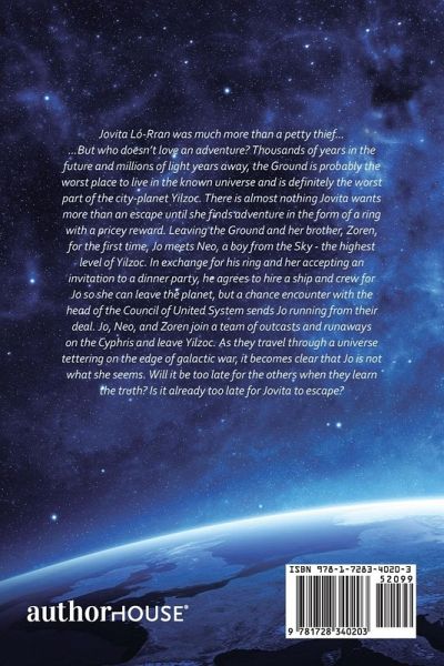 Jovita Ló-Rran was much more than a petty thief... ...But who doesn't love an adventure? Thousands of years in the future and millions of light years away, the Ground is probably the worst place to live in the known universe and is definitely the worst part of the city-planet Yilzoc. There is almost nothing Jovita wants more than an escape until she finds adventure in the form of a ring with a pricey reward. Leaving the Ground and her brother, Zoren, for the first time, Jo meets Neo, a boy from the Sky - the highest level of Yilzoc. In exchange for his ring and her accepting an invitation to a dinner party, he agrees to hire a ship and crew for Jo so she can leave the planet, but a chance encounter with the head of the Council of United System sends Jo running from their deal. Jo, Neo, and Zoren join a team of outcasts and runaways on the Cyphris and leave Yilzoc. As they travel through a universe tettering on the edge of galactic war, it becomes clear that Jo is not what she seems. Will it be too late for the others when they learn the truth? Is it already too late for Jovita to escape?