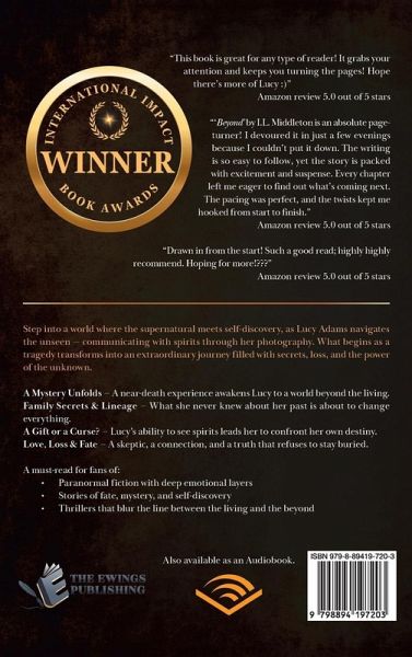 "This book is great for any type of reader! It grabs your attention and keeps you turning the pages! Hope there's more of Lucy :)" Amazon review 5.0 out of 5 stars "'Beyond' by I.L. Middleton is an absolute pageturner! I devoured it in just a few evenings because I couldn't put it down. The writing is so easy to follow, yet the story is packed with excitement and suspense. Every chapter left me eager to find out what's coming next. The pacing was perfect, and the twists kept me hooked from start to finish." Amazon review 5.0 out of 5 stars "Drawn in from the start! Such a good read; highly highly recommend. Hoping for more!???" Amazon review 5.0 out of 5 stars Step into a world where the supernatural meets self-discovery, as Lucy Adams navigates the unseen - communicating with spirits through her photography. What begins as a tragedy transforms into an extraordinary journey filled with secrets, loss, and the power of the unknown. A Mystery Unfolds - A near-death experience awakens Lucy to a world beyond the living. Family Secrets & Lineage - What she never knew about her past is about to change everything. A Gift or a Curse? - Lucy's ability to see spirits leads her to confront her own destiny. Love, Loss & Fate - A skeptic, a connection, and a truth that refuses to stay buried. A must-read for fans of: ¿ Paranormal fiction with deep emotional layers ¿ Stories of fate, mystery, and self-discovery ¿ Thrillers that blur the line between the living and the beyond
