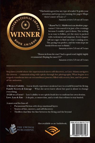 "This book is great for any type of reader! It grabs your attention and keeps you turning the pages! Hope there's more of Lucy :)" Amazon review 5.0 out of 5 stars "'Beyond' by I.L. Middleton is an absolute pageturner! I devoured it in just a few evenings because I couldn't put it down. The writing is so easy to follow, yet the story is packed with excitement and suspense. Every chapter left me eager to find out what's coming next. The pacing was perfect, and the twists kept me hooked from start to finish." Amazon review 5.0 out of 5 stars "Drawn in from the start! Such a good read; highly highly recommend. Hoping for more!???" Amazon review 5.0 out of 5 stars Step into a world where the supernatural meets self-discovery, as Lucy Adams navigates the unseen - communicating with spirits through her photography. What begins as a tragedy transforms into an extraordinary journey filled with secrets, loss, and the power of the unknown. A Mystery Unfolds - A near-death experience awakens Lucy to a world beyond the living. Family Secrets & Lineage - What she never knew about her past is about to change everything. A Gift or a Curse? - Lucy's ability to see spirits leads her to confront her own destiny. Love, Loss & Fate - A skeptic, a connection, and a truth that refuses to stay buried. A must-read for fans of: ¿ Paranormal fiction with deep emotional layers ¿ Stories of fate, mystery, and self-discovery ¿ Thrillers that blur the line between the living and the beyond