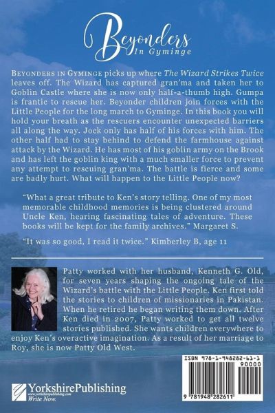 BEYONDERS IN GYMINGE picks up where The Wizard Strikes Twice leaves off. The Wizard has captured gran’ma and taken her to Goblin Castle where she is now only half-a-thumb high. Gumpa is frantic to rescue her. Beyonder children join forces with the Little People for the long march to Gyminge. In this book you will hold your breath as the rescuers encounter unexpected barriers all along the way. Jock only has half of his forces with him. The other half had to stay behind to defend the farmhouse against attack by the Wizard. He has most of his goblin army on the Brook and has left the goblin king with a much smaller force to prevent any attempt to rescuing gran’ma. The battle is fierce and some are badly hurt. What will happen to the L ittle People now?