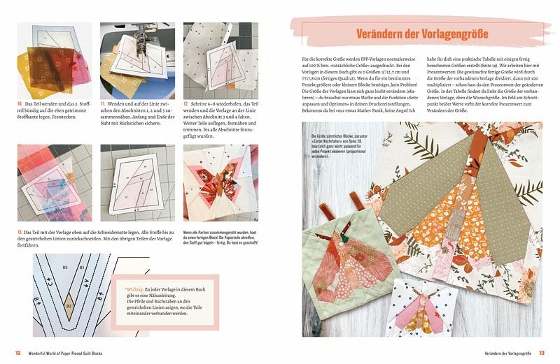 - Für Anfänger und Fortgeschrittene: Ein ausführlicher Grundlagenteil und klare Schritt-für-Schritt-Anleitungen erklären die Technik des Foundation Paper Piecing, sodass auch Einsteiger sofort loslegen können. Fortgeschrittene finden hier anspruchsvollere Designs für individuelle Projekte.