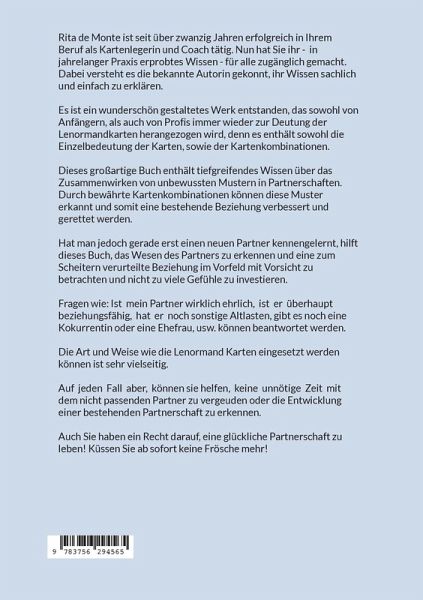 Rita de Monte ist seit über zwanzig Jahren erfolgreich in Ihrem Beruf als Kartenlegerin und Coach tätig. Nun hat Sie ihr - in jahrelanger Praxis erprobtes Wissen - für alle zugänglich gemacht. Dabei versteht es die bekannte Autorin gekonnt, ihr Wissen sachlich und einfach zu erklären.Es ist ein wunderschön gestaltetes Werk entstanden, das sowohl von Anfängern, als auch von Profis immer wieder zur Deutung der Lenormandkarten herangezogen wird, denn es enthält sowohl die Einzelbedeutung der Karten, sowie der Kartenkombinationen.Dieses großartige Buch enthält tiefgreifendes Wissen über das Zusammenwirken von unbewussten Mustern in Partnerschaften. Durch bewährte Kartenkombinationen können diese Muster erkannt und somit eine bestehende Beziehung verbessert und gerettet werden. Hat man jedoch gerade erst einen neuen Partner kennengelernt, hilft dieses Buch, das Wesen des Partners zu erkennen und eine zum Scheitern verurteilte Beziehung im Vorfeld mit Vorsicht zu betrachten und nicht zu viele Gefühle zu investieren. Fragen wie: Ist mein Partner wirklich ehrlich, ist er überhaupt beziehungsfähig, hat er noch sonstige Altlasten, gibt es noch eine Kokurrentin oder eine Ehefrau, usw. können beantwortet werden.Die Art und Weise wie die Lenormand Karten eingesetzt werden können ist sehr vielseitig. Auf jeden Fall aber, können sie helfen, keine unnötige Zeit mit dem nicht passenden Partner zu vergeuden oder die Entwicklung einer bestehenden Partnerschaft zu erkennen.Auch Sie haben ein Recht darauf, eine glückliche Partnerschaft zu leben! Küssen Sie ab sofort keine Frösche mehr!