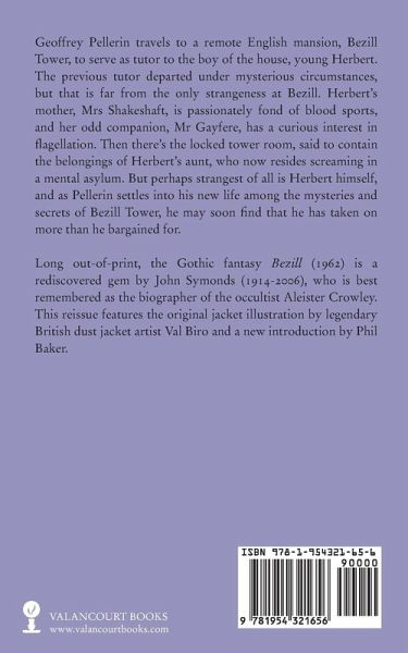 Geoffrey Pellerin travels to a remote English mansion, Bezill Tower, to serve as tutor to the boy of the house, young Herbert. The previous tutor departed under mysterious circumstances, but that is far from the only strangeness at Bezill. Herbert's mother, Mrs Shakeshaft, is passionately fond of blood sports, and her odd companion, Mr Gayfere, has a curious interest in flagellation. Then there's the locked tower room, said to contain the belongings of Herbert's aunt, who now resides screaming in a mental asylum. But perhaps strangest of all is Herbert himself, and as Pellerin settles into his new life among the mysteries and secrets of Bezill Tower, he may soon find that he has taken on more than he bargained for. Long out-of-print, the Gothic fantasy Bezill (1962) is a rediscovered gem by John Symonds (1914-2006), who is best remembered as the biographer of the occultist Aleister Crowley. This reissue features the original jacket illustration by legendary British dust jacket artist Val Biro and a new introduction by Phil Baker.