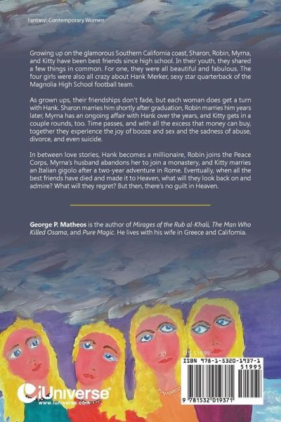 Growing up on the glamorous Southern California coast, Sharon, Robin, Myrna, and Kitty have been best friends since high school. In their youth, they shared a few things in common. For one, they were all beautiful and fabulous. The four girls were also all crazy about Hank Merker, sexy star quarterback of the Magnolia High School football team. As grown ups, their friendships don’t fade, but each woman does get a turn with Hank. Sharon marries him shortly after graduation, Robin marries him years later, Myrna has an ongoing affair with Hank over the years, and Kitty gets in a couple rounds, too. Time passes, and with all the excess that money can buy, together they experience the joy of booze and sex and the sadness of abuse, divorce, and even suicide. In between love stories, Hank becomes a millionaire, Robin joins the Peace Corps, Myrna’s husband abandons her to join a monastery, and Kitty marries an Italian gigolo after a two-year adventure in Rome. Eventually, when all the best friends have died and made it to Heaven, what will they look back on and admire? What will they regret? But then, there’s no guilt in Heaven.
