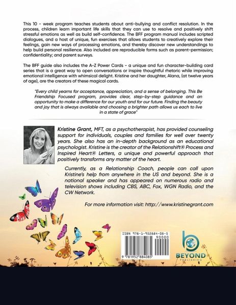 A Simple Way For Anyone to Mentor Kids ages 8-12- Now includes the A-Z Power Cards for inspiring thoughtful conversations. A small-group program for anti-bullying and peer conflict-resolution through self-empowerment and social skills development This 10 - week program teaches students about anti-bullying and conflict resolution skills. In the process, children learn important life skills that they can use to resolve and positively shift stressful emotions as well as build self-confidence. The BFF program manual includes scripted dialogues, and a host of unique, fun exercises that allows students to creatively explore their feelings, gain new ways of processing emotions, and thereby discover new understandings to help build personal resilience. Also included are reproducible forms such as parent-permission; confidentiality; and parent surveys. Moreover, Kristine and her daughter, Alana, created the A-Z Power Deck: an inspirational and thoughtful set of 26 illustrated cards for inspiring meaningful conversation and character building concepts also included in this BFF program manual. For more information visit: www.kristinegrant.com or text: 858-500-2277