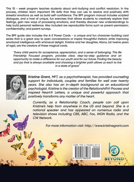 A Simple Way For Anyone to Mentor Kids ages 8-12- Now includes the A-Z Power Cards for inspiring thoughtful conversations. A small-group program for anti-bullying and peer conflict-resolution through self-empowerment and social skills development. This 10 - week program teaches students about anti-bullying and conflict resolution skills. In the process, children learn important life skills that they can use to resolve and positively shift stressful emotions as well as build self-confidence. The BFF program manual includes scripted dialogues, and a host of unique, fun exercises that allows students to creatively explore their feelings, gain new ways of processing emotions, and thereby discover new understandings to help build personal resilience. Also included are reproducible forms such as parent-permission; confidentiality; and parent surveys. Moreover, Kristine and her daughter, Alana, created the A-Z Power Deck: an inspirational and thoughtful set of 26 illustrated cards for inspiring meaningful conversation and character building concepts also included in this BFF program manual.