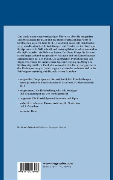 Wer als Praktiker oder Wissenschaftler eine gründliche und verständlich geschriebene Übersicht als Schlüssel zur Rspr. des BGH ausgehend von den Problemen sucht, ist mit Grafs Werk bestens bedient, das alle Aspekte der Entwicklung der deutschen höchstrichterlichen Judiaktur erschöpfend, übersichtlich und mit einem solchen systematisierenden Zugriff abhandelt, der als Alleinstellungsmerkmal im wissenschaftlichen Schrifttum verstanden werden kann. Nicht unerwähnt sei, dass das Werk auch für studentische Examenskandidaten und Rechtsreferendare vor der Großen Staatsprüfung zur Prüfnugsvorbereitung bestens zu empfehlen ist: Nirgends erhält man eine solcherart aktuell, qualitätvoll und verlässlich aufbereitete Übersicht über die in der Schwerpunktsetzung klug akzentuierten wichtigsten Fälle der höchstrichterlichen strafrechtlichen Rechtsprechung in Deutschland. Um die Summe zu ziehen: Chapeau, das Buch schließt eine wirkliche Marktlücke!"