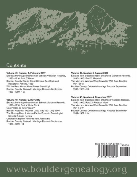 Extracts from Superintendent of Schools Visitation Records, 1890-1910: Part IX Bader; Part X White Rock; Part XI Marshall; Part XII Pleasant View Boulder County District Court Criminal Fee Book and Register of Actions, 1889 Will the Real Alonzo Allen Please Stand Up! Boulder County, Colorado Marriage Records September 1939-1959: F-M One Person or Two People? Boulder Historical Weather Data, May 1901-July 1901 The Missing Man: A Morton Farrier Forensic Genealogist Novella: A Book Review Colorado Adoption Records Now Accessible The Men and Women Who Served in WWI from Boulder, Parts I and II of VI