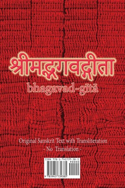 Bhagavad Gita in Sanskrit along with Roman Transliteration (but NO Translation). Please Note: This is only a SANSKRIT Edition, without Hindi / English Translation.For the English Translation please refer to our other Edition: Bhagavad Gita, the Holy Book of Hindus : Original Sanskrit Text with English Translation and Transliteration [ a Classic of Indian Spirituality ] having ISBN: 978-1-945739-37-8 (Hardcover) or ISBN: 978-1-945739-36-1 (Paperback)