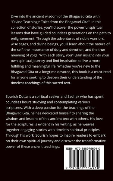 The Bhagavad Gita, one of the most revered and beloved texts of the Hindu tradition, is a timeless source of wisdom and inspiration for spiritual seekers around the world. In this book, author Sourish Dutta presents a collection of short stories inspired by the teachings of the Gita. Each story is crafted to illustrate a particular lesson or principle from the text and is designed to inspire readers to reflect on their own lives, values, and spiritual journeys. The stories are written in a simple, accessible style that is easy to read and understand, making them ideal for anyone interested in exploring the wisdom of the Gita. From tales of courage and sacrifice to stories of love and devotion, each story in Divine Tales is designed to capture the essence of a particular teaching from the Gita. Some stories are set in the ancient world of India, while others take place in modern times or in fantastical realms beyond our everyday experience. But all of them offer insights and guidance that can help readers connect with their own spiritual path and find greater peace and fulfillment in their lives. Whether you are a seasoned practitioner of yoga and meditation, or simply someone seeking to live a more meaningful and purposeful life, Divine Tales is a book that can inspire and uplift you. It is a beautiful tribute to the wisdom of the Bhagavad Gita, and a powerful reminder of the universal truths that lie at the heart of all spiritual traditions.