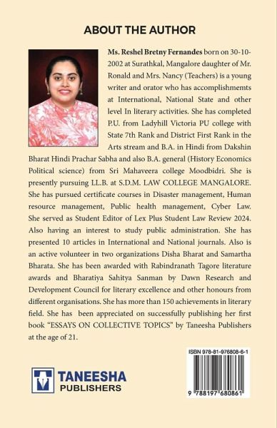 The book "Bharat @ 2047 : Role of Youth - A View from the Young" is a testament to the limitless potential of Bharat's youth and its resilient spirit. Reshel Bretny Fernandes takes us on an inspiring and reflective journey towards 'Viksit Bharat' by 2047 with the nation's youth as the torchbearers of this revolution. Drawing inspiration from the timeless teachings of renowned leaders such as Sardar Patel, Aurobindo Ghosh, Dattopant Thengadi, Swami Vivekananda and many others, Reshel offers an inquisitive insight into the path for the country and the nation's youth during the next two decades. Reshel puts forth a collage of ideas and goals interwoven with strands of optimism, persistence, and courage. The book provides a comprehensive viewpoint on the role of the youth in determining the destiny of our nation, taking into account everything from vibrant Bharatiya culture to the landscape of modern challenges. The author offers valuable insights into the role that youth play in determining the future of our country through a thorough examination of a variety of topics such as manufacturing, sustainable development, social justice, science, innovation, and leadership. The book emphasises how innovative thinking and youthful optimism may create positive change and promote a more just and inclusive society. Congratulations to Reshel Bretny Fernandes. Best Wishes to the talented young writer from Mangaluru. - Shri Rajesh Padmar (Professor), Bengaluru