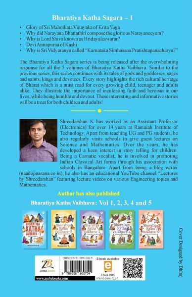 · Glory of Sri Mahotkata Vinayaka of Krita Yuga · Why did Narayana Bhattathiri compose the glorious Narayaneeyam? · Why is Lord Shiva known as Hridayaleswarar? · Devi Annapurna of Kashi · Why is Sri Vidyaranya called "Karnataka Simhasana Pratishtapanacharya? The Bharatiya Katha Sagara series is being released after the overwhelming response for all the 5 volumes of Bharatiya Katha Vaibhava. Similar to the previous series, this series continues with its tales of gods and goddesses, sages and saints, kings and devotees. Every story highlights the rich cultural heritage of Bharat which is a must-read for every growing child, teenager and adults alike. They illustrate the importance of inculcating faith and heroism in our lives while being humble and devout. These interesting and informative stories will be a treat for both children and adults! 108 pages of delightful coloured illustrations.