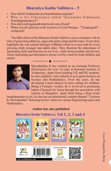 Indian Short Stories for Kids The fifth edition of the Bharatiya Katha Vaibhava series continues with its tales of gods and goddesses, sages and saints, kings and devotees. Indian short stories for kids highlights the rich cultural heritage of Bharat which is a must read for every growing child, teenager and adults alike. They illustrate the importance of inculcating faith and heroism in our lives, while being humble and devout. These interesting and informative stories will be a treat for both children and adults! Stories in Bharatiya Katha Vaibhava 5 Origin of Sri Venkateshwara Suprabhatam 2. Bhima meets Hanuman 3. Dwelling for Lord Shiva! 4. Sri Sampat Lakshmi Vrata 5. Govardhana Giridhari: Sri Govinda 6. Sri Vadiraja Tirtha 7. Aswathama Bargains for the Sudarshana Chakra 8. Nageswar Jyotirlinga 9. Samudra Manthana: Churning of the Milk-Ocean! 10. Sri Arunagirinathar. 11. The Fire-touch Rakshasa: Bhasmasura 12. Lord Jagannatha and His Friend-devotee 13. Sage Agastya 14. Sri Rama and the Kalpavriksha 15. Sage Narada and Hari! 16. King Mayuradhwaja 17. Alluri Venkatadri Swami and the Lord's Diamond Crown 18. Krishna and the Peanut Diet! 19. Devi and the Asuras 20. Sri Rama Paduka Pattabhisheka 21. Krishna and Akrura 22. Hanuman Crosses the Ocean 23. Vamana Avatara 24. Guruvayoor Sri Krishna 25. Rukmini Kalyana To read the other Bharatiya katha vaibhavas