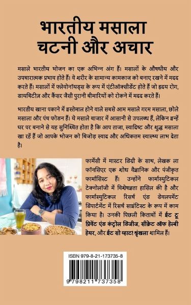 Bhartiya Masala Chutney aur Achar cookbook me aap bhartiya bhojan ka swad badhaane wale masale, chutniya aur achar ki recipes payenge. Masale bhartiya bhojan ka ek abhinn ang hain. masalon ke aushadhiya aur upcharatmak prabhaav hote hain. Ve sharir ke samaanya kaamkaj ko banae rakhane mein madad karate hain. Masalon mein flavonoids ke roop mein antoxidants hote hain jo dil ki bimari, diabetes aur cancer jaisi purani bimariyon ko rokane me madad karate hain. Bhartiya khana pakaane me istemaal hone wale sabse aam masale garam masala, chhole masala aur panch phodan hain. Ye masale bazar mein asaani se upalabdh hain, lekin inhein ghar par banaane se yeh sunishchit hota hai ki aap taaja, swadisht aur shuddh masala kha rahein hain jo apke bhojan ko swad aur aapko adhikatam swasthya laabh deta hai.